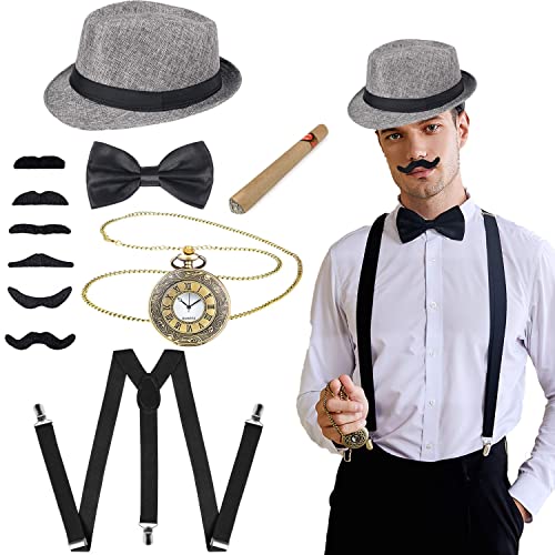 YeahBoom Set di costumi mafiosi da uomo degli anni '20, set di costumi da Gatsby, set di accessori per costumi che include cappello di Panama, bretelle elastiche regolabili, orologio da tasca vintage