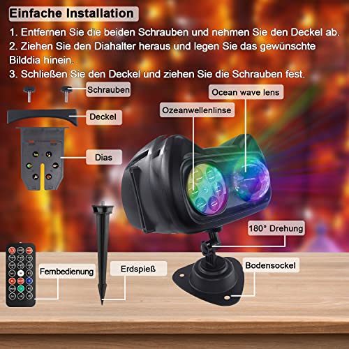 Il miglior regalo per Natale - Decora la sala o decora le pareti con questo elegante proiettore a doppia testa. Varie funzioni lo rendono la scelta perfetta per creare un'atmosfera da sogno, adatta a San Valentino, Natale, Halloween, Capodanno. Può essere utilizzato anche come luce notturna con effetto increspatura dell'acqua in camera da letto o in piscina per l'uso quotidiano.