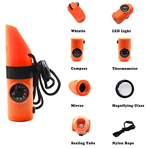 【7 in 1 Fischietto】 Fischietto multifunzionale, può essere usato come fischietto di emergenza, bussola, termometro, torcia a LED, lente d'ingrandimento, specchio di segnalazione e piccolo contenitore, per soddisfare tutte le esigenze dell'avventura dei bambini e del campeggio, ed essere un piccolo esploratore.
