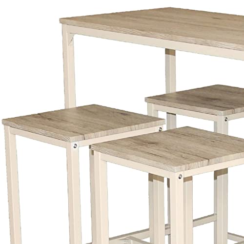MATERIALE: Piani rivestiti di PVC simile legno rovere sbiancato. Struttura in metallo colore beige. Utilizzo domestico. Piedini in plastica. Sono da interno. Portata tavolo 40 kg. Portata sgabello 100 kg.