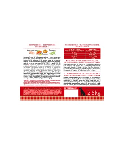 Ingredienti: Salmone e trota 50% (compresi salmone e trota preparati freschi 36%, salmone disidratato 12% e brodo di salmone 2%), Boniato 24%, Piselli 9%, patate, polpa di barbabietole, semi di lino, integratore Omega 3, Minerali, vitamine, brodo vegetale, sparagi 0,3%, FOS 96 mg/kg e MOS 2014 mg/kg