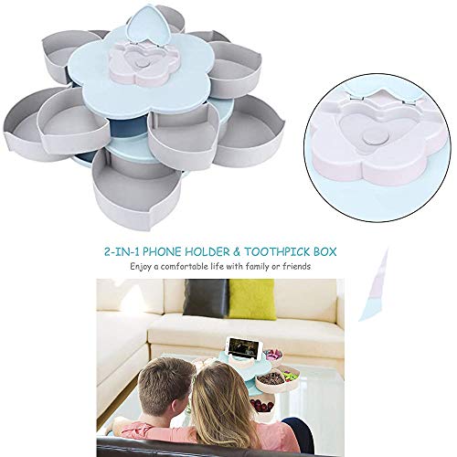 Ygapuzi Double Deck Snack Box a forma di fiore rotante caramelle contenitori di servizio con supporto telefonico, 10 griglia snack vassoio di stoccaggio per caramelle, noci, patatine, olive (Blu)