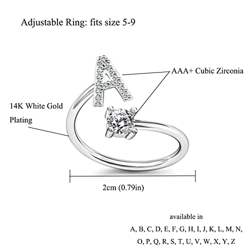 Yifnny Anello Alfabeto, Anello Iniziale 26 Alfabeto Intarsiato Cubic Zirconia Lettera Maiuscola A-Z Anello Aperto Regolabile per Dito Medio Argento Lettera Iniziale Anelli per Donne (R)
