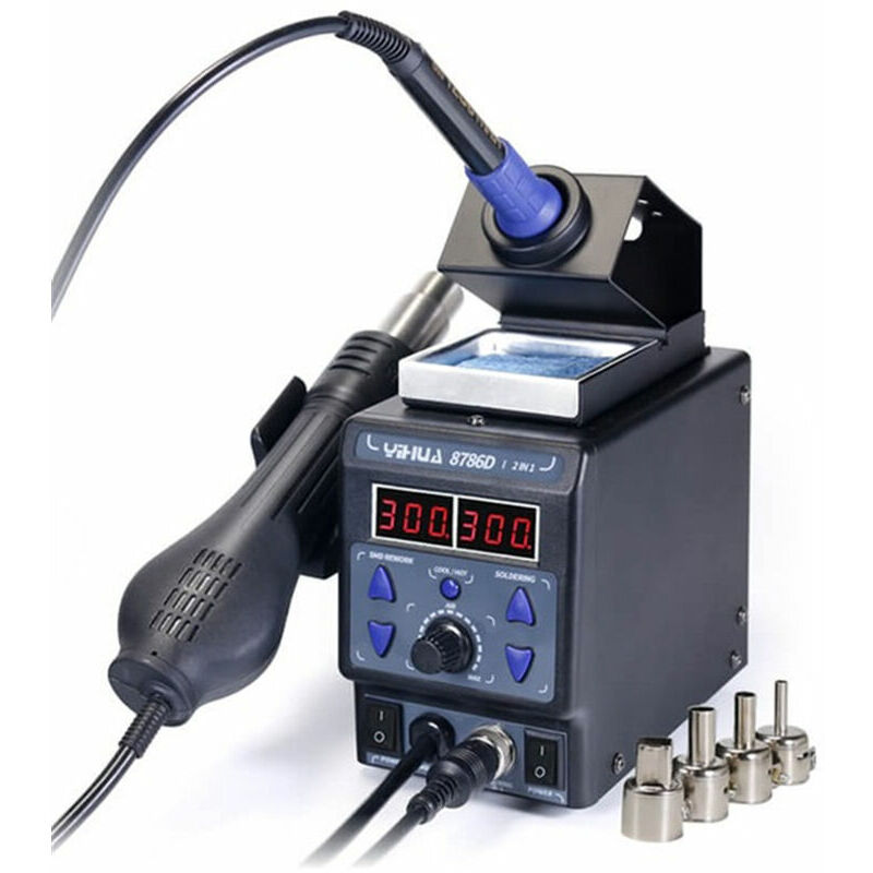 Caratteristiche: Correzione digitale della temperatura Allo stesso tempo, tieni premuto il pulsante della temperatura dell'aria g-un (saldatore) per 2 secondi. Quando il numero dell'aria g-un (saldatore) appare piccolo punto, può essere corretto dal pulsante della temperatura. Allo stesso tempo, tieni premuto il pulsante della temperatura dell'aria g-un (saldatore) per salvare e uscire. Funzione aria fredda (l'aria fredda può abbassare la temperatura dell'aria calda più velocemente) 10 minuti di standby automatico Design del pannello inclinato di 85 gradi, più comodo da usare. Il supporto in ferro può essere posizionato sulla macchina, stabile e risparmiare spazio sul tavolo di lavoro. Commutazione aria calda e fredda. Display di commutazione a 1 tasto Aria calda g-undisplay e saldatore La luce LED rossa è: stato di visualizzazione del saldatore LED azzurro: aria calda g-undisplay stato Specifica: Modello: 8786D I (aggiornamento) Dimensioni: 148*99*134 mm Peso: 2,5 kg Potenza
