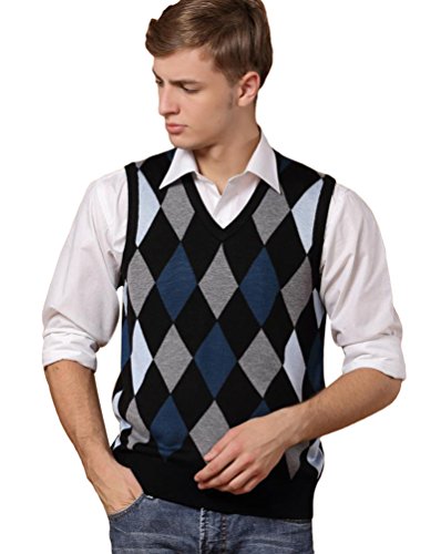 Yiiquan Uomo Giubbotto di Lana, Griglia Gilet Senza Maniche Striscia Scollo V Maglione (Nero, Aisa XL)