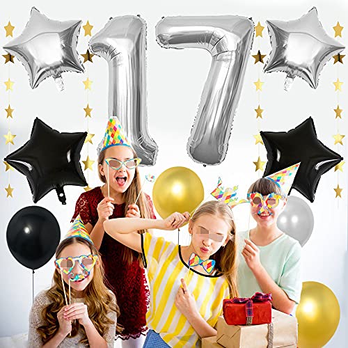 Yijunmca Set palloncini 17° compleanno festone compleanno per 17 anni per festa compleanno forma cuore a forma di stella in lattice coriandoli con numeri per anniversario matrimonio argento e nero