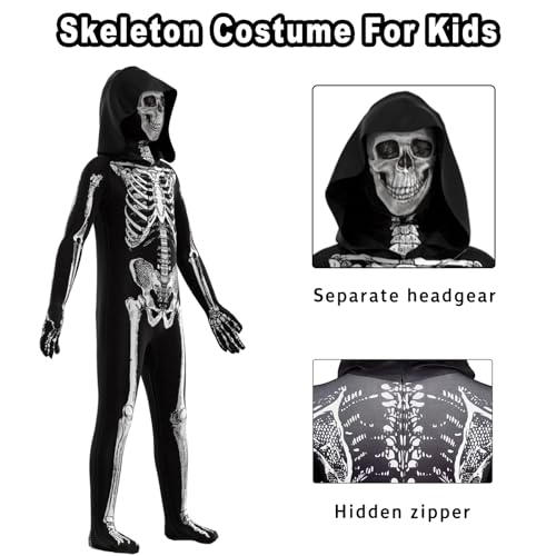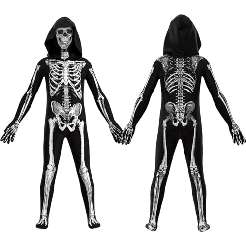 Skeleton Costume Kids - Costume da scheletro include tuta con cappuccio×1, maschera×1.Confezione di grande valore per il gioco di ruolo, perfetta per Halloween, Carnevali, Horror Grim Reaper Theme Party Costumes Kids.