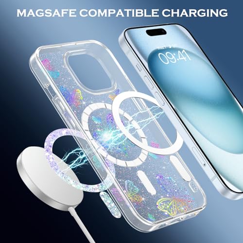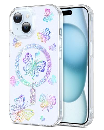 YINLAI Cover magnetica per iPhone 15 6,1 pollici, compatibile con MagSafe Custodia iPhone 15 glitterata a farfalla Case iPhone 15 Antiurto Antigraffio Protezione Telefono Cover - Glitter trasparente
