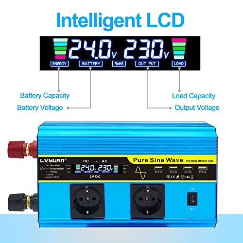 Convertisseur de tension, énergie d'entrée des batteries 24V dans les voitures, bateaux, caravanes ou autres sources d'alimentation et d'énergie, convertit en puissance sinusoïdale pure pour les appareils tels que les réfrigérateurs, les ordinateurs, les cafés, les perceuses, les compresseurs.