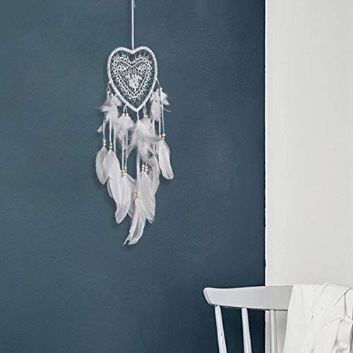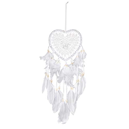 Yinuoday, Acchiappa-sogni con piume bianche, con luce a LED da appendere alla parete, decorazione per camera da letto o matrimonio (forma a cuore #A)