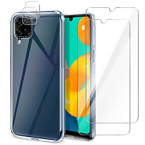Compatibilità: Trasparente Custodia Cover Compatibile con Samsung Galaxy M32 4G 6.4" (NON PER M32 5G), Pacchetto Include: 1 Pezzi Cover, 2 Pezzi Vetro Temperato Pellicola Protettiva, 2 Pezzi Protettore Lente Fotocamera.