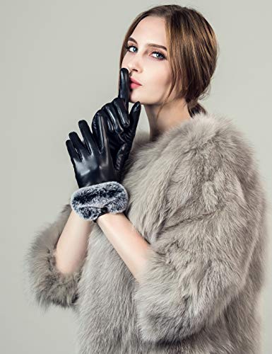 FASHIONABLE DESIGN STYLE - Questi meravigliosi guanti da sera in pelle sono pratici e alla moda, con un morbido e caldo polsino in pelliccia di coniglio al 100% che copre il polso. I nostri guanti eleganti e sofisticati sono adatti per l'uso quotidiano e per le occasioni speciali. Per la donna che apprezza il lusso che è sottovalutato, questi guanti si adattano al disegno di legge.
