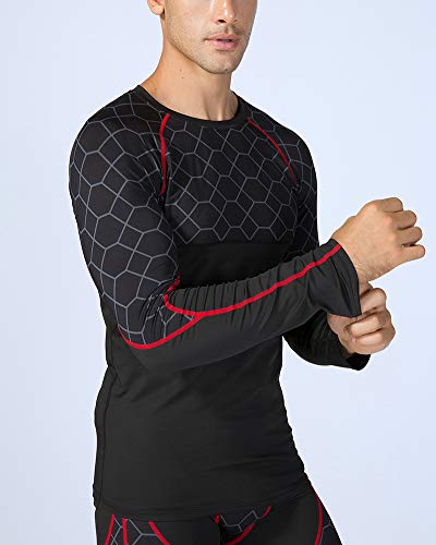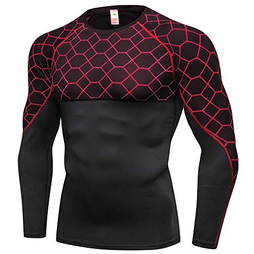 Yishengwan Maglietta a Compressione Uomo Manica Lunga Maglia da Termica Stampa a Griglia Asciugatura Rapida Rosso XXL