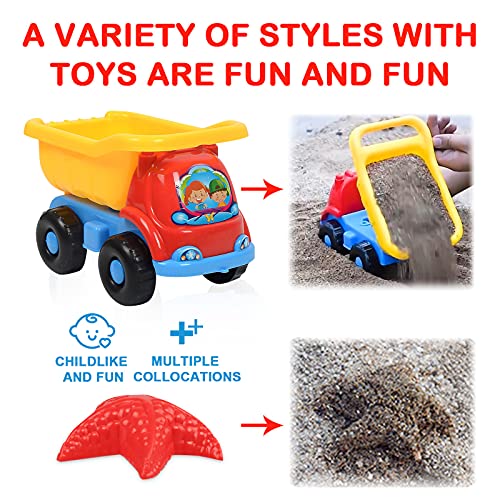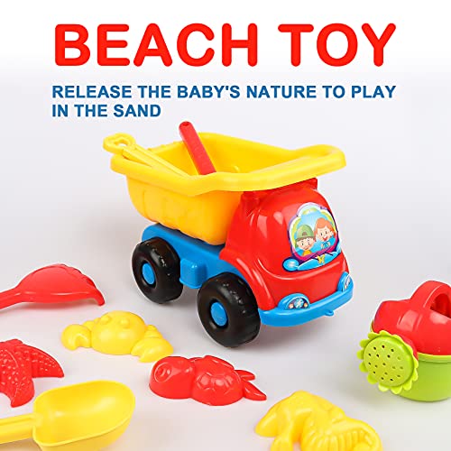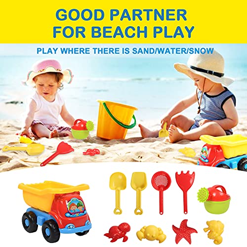 Yisscen Set Giochi Sabbia per Bambini, 10 Pezzi Spiaggia di Sabbia Giocattoli Inclusi Autocarro Ribaltabile, Stampi per Sabbia, Pale, Annaffiatoio, Borsa a Rete, per 2 3 4 5+Anni Ragazzi Ragazze