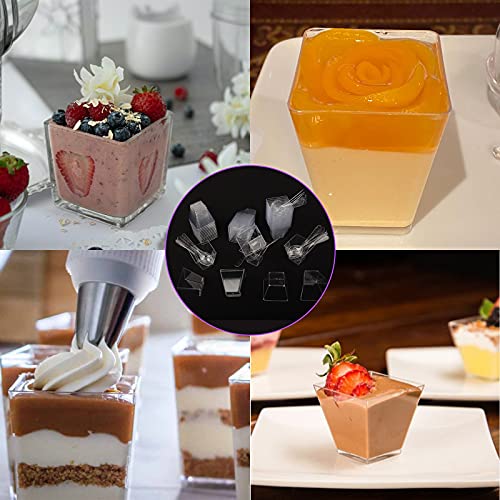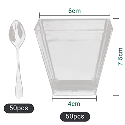 Yisscen 50 Pezzi Tazze da Dessert con Cucchiai,160ML Coppette da Dessert Plastica Riutilizzabile Bicchierini da Dessert Trasparente per Aperitivo,Finger food,Essert,Budino(Quadrato)