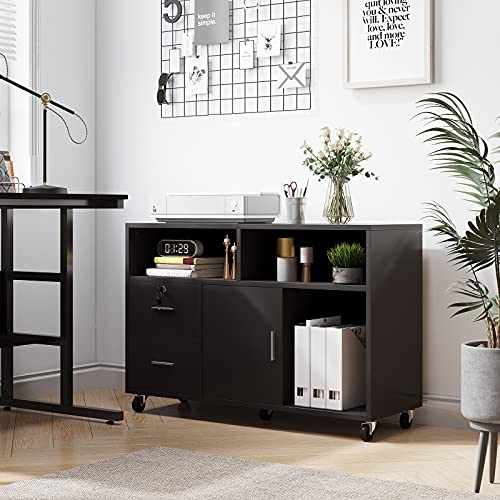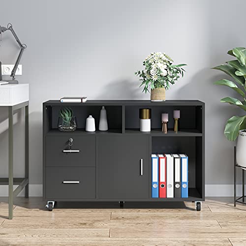 YITAHOME Armadietto per archivio in legno, armadietto per archivio laterale mobile a 2 cassetti, supporto per stampante con serratura e ripiani aperti per l'home office,