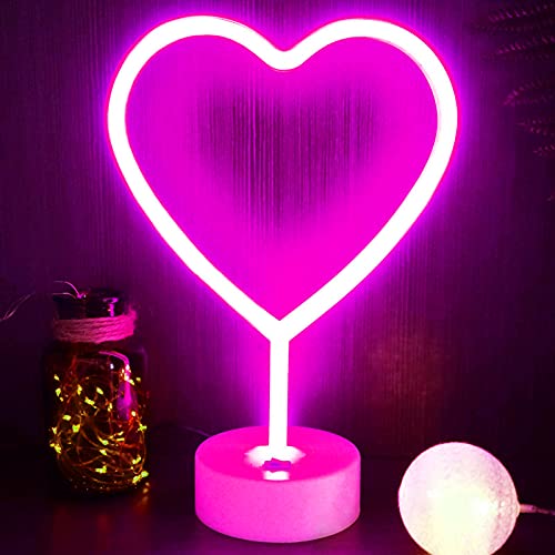 YIVIYAR Insegna al Neon a Forma di Cuore Insegne al Neon a LED con Supporto di Base, Decorazione da Tavolo USB o Batteria Noen LED Luci da Camera da Letto al Neon Rosa per Decorazioni di Nozze(Heart)