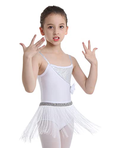 YiZYiF Vestito da Latino Bambina Glitter Leotard con Nappa Elegante Latino Americano Vestito da Ballo con 3D Fiore Amovibile Paillettes Body da Danza Dancewear Allenamento Frange Bianco 10 Anni