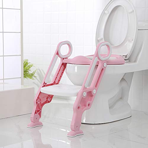 YJIIJY Riduttore WC per Bambini con Scaletta Regolabile, Baby Training WC Vasino Sedile, Antiscivolo, Design Pieghevole (Rosa-Bianco)