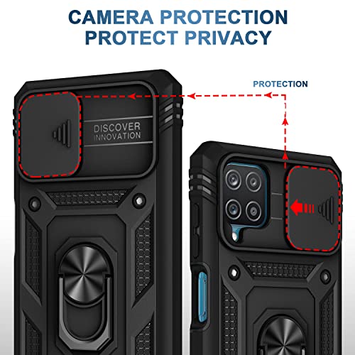 YNMEacc Cover Samsung Galaxy A12/M12 con 2 Pezzi Vetro Temperato, Cover Samsung A12 Fotocamera Slidable con Grado Militare 360° Magnetica Ring Supporto Antiurto Custodia per Samsung A12/M12, Nero