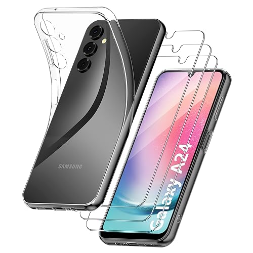 YNMEacc Cover per Samsung Galaxy A24 4G 6,5 Pollici con 3 Pezzi Vetro Temperato, AntiGraffio Protettiva Cover Samsung A24, Morbida TPU Silicone Antiurto Custodia Samsung Galaxy A24 4G - Trasparente