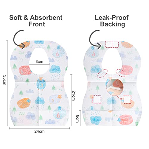 Leggero e traspirante. Il lato anteriore di ogni bavaglino è assorbente, mentre quello posteriore è impermeabile. I bavaglini monouso sono la soluzione perfetta per il bambino per mangiare in casa o nell'asilo e anche in ogni viaggio nel modo più semplice e veloce possibile.