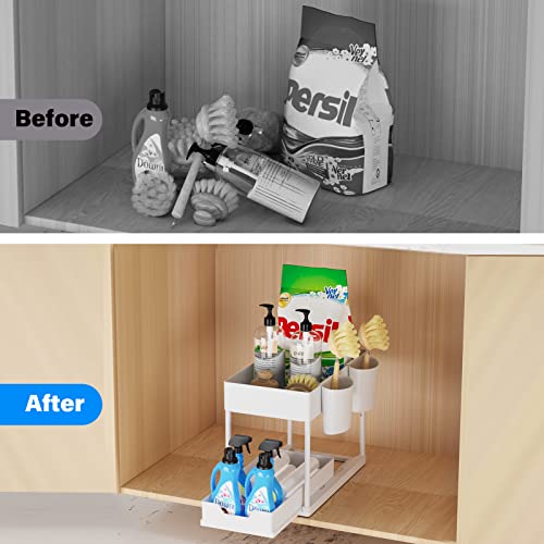 YOCOLE Organizer Sottolavello Cucina 2 Livelli, Alzare 34 cm Scorrevole Scaffale Sottolavello Cassetti con 4 Ganci e 2 Bacinelle Sospese, Multiuso Organizzatore Sotto Lavello per Bagno