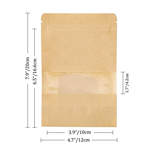 YOFADCI 50pcs Carta Kraft Bag Stand Up Zip Blocco Cibo Marrone Sacchetto di Carta a Finestra Trasparente Stoccaggio Cibo Riutilizzabile Borsa Il pane Noci Regalo Chicchi di Caffè 12x20cm