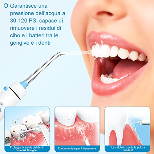 【Pulizia efficace】 L'effetto dell'utente è doppio rispetto al filo interdentale convenzionale, poiché il flusso di impulsi è in grado di eliminare efficacemente cibo e batteri tra i denti e le gengive (l'effetto: testato oltre 99, 9%)