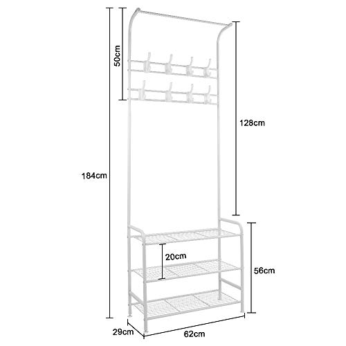 YOLEO Appendiabiti, Appendiabiti da Terra con 18 Ganci, Stand Appendiabiti di Metallo, Stabile, con Ripiano per Scarpe, 184 x 62 x 29 cm, Bianco