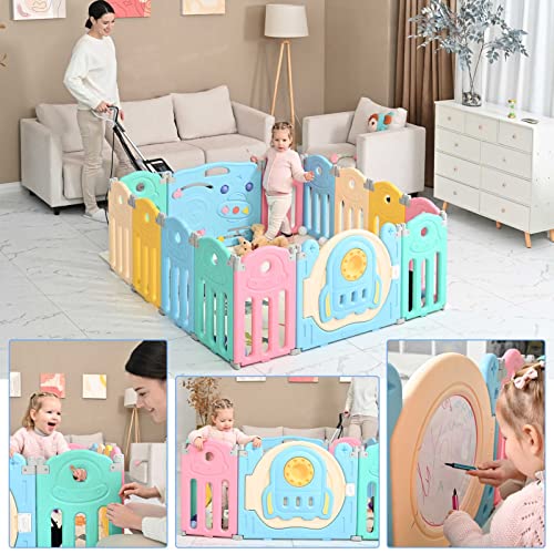 YOLEO Recinto per Bambini, Box Bambini Pieghevole con Tavolo da Disegno Portatile, Cancello Richiudibile a Chiave e Doppie Recinzioni Antiscivolo, Recinto Neonato 12+2 Pannelli (Colorato)