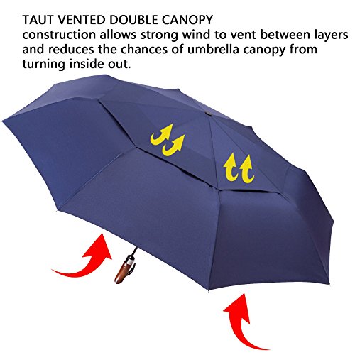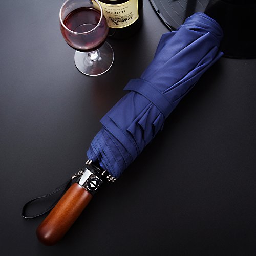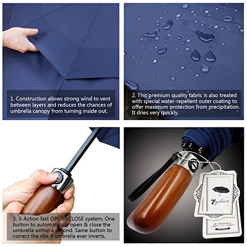 Yolococa Double-canopy Travel Umbrella ¨C Auto open and close - Waterproof & Windproof with Sturdy Wooden Handle for Men and Women Folding Umbrella Blue