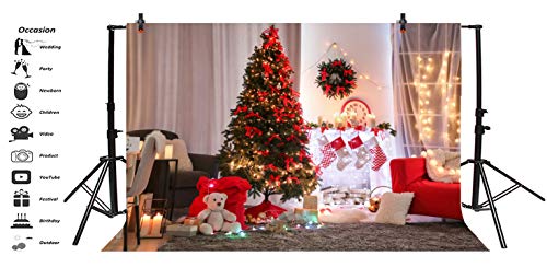 YongFoto 3x2m Fondale Foto Albero Natale Bowknots rosso I regali Camino Calze autoreggenti Candele Garland natalizio Le tende Divano Tappeto Sfondo fotografico Photo Booth Partito Banner Photo Studio