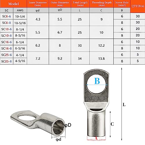 YoniYa 130PCS Terminali elettrici 6-25 mm², Terminali a crimpare con occhiello rotondo Capocorda cavo batteria auto moto rame stagnato
