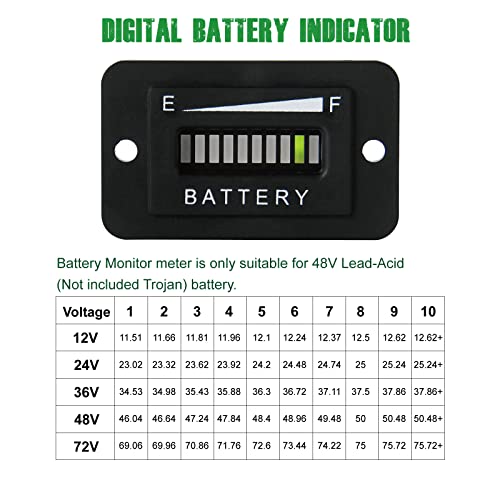 【INDICATORE DELLA BATTERIA da 48 V】: l'indicatore della batteria è adatto solo per le apparecchiature con batterie al piombo-acido da 48 V (batteria Trojan non inclusa).