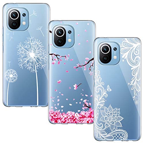 Yoowei [3-Pack] Cover Compatibile con Xiaomi Mi 11 Trasparente Disegni Morbido Silicone Ultra Sottile Custodia TPU Flessibile Gomma Protettiva Caso, Fiori Bianco + Fiore di Ciliegio + Tarassaco
