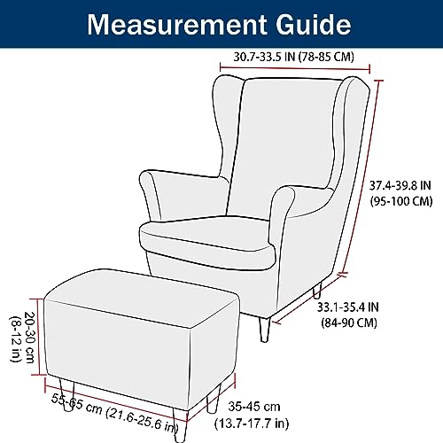 Vestibilità personalizzata per un fascino di classe: su misura alla perfezione, la nostra fodera per sedia ad ala si adatta perfettamente (84-90 cm di lunghezza, 95-100 cm di altezza, 78-85 cm di larghezza dello schienale) mentre la fodera del pouf (55-65 cm di lunghezza, 35-45 cm di larghezza, 20- 30 cm di altezza) aggiunge un tocco di stile.