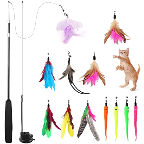 Yosemy 14 Pezzi Giocattoli per Gatti, Feather Toys, Gatto Giocattoli Interattivi, con Un Base a Ventosa Solida, con 2 PCS Bacchetta Telescopica e 12 PCS Sostituzione di Piume / Insetti con Campane