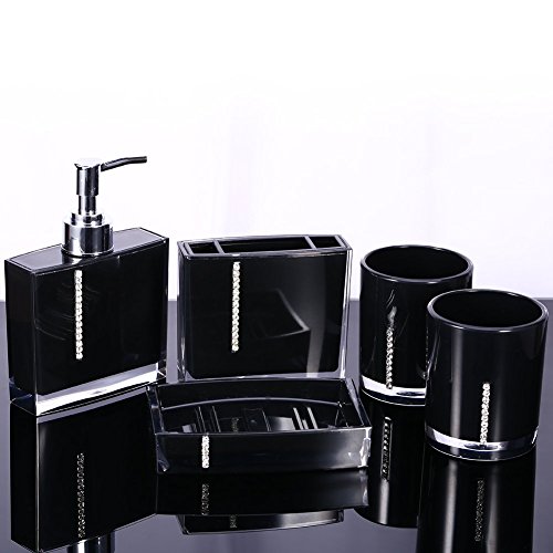 Yosoo, set di 5 accessori per bagno Luxury, in plastica, con dispenser sapone, porta spazzolini, portasapone e 2 bicchieri Black