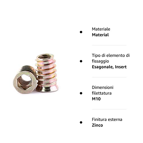 Yosoo Health Gear Dadi di inserimento filettati da 20 pezzi, inserti in legno filettati con azionamento esagonale placcati in zinco per l'assortimento di mobili in legno(M10*25mm)