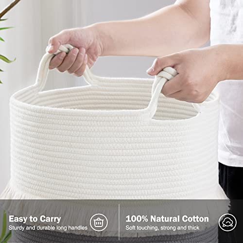 YOUDENOVA Cesto portaoggetti in corda intrecciata, con nappe boho, cesto per la biancheria per la scuola materna, per bambini, bianco e grigio, 40.6x43.2 cm