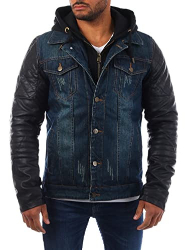 Young & Rich 2 in 1 Jeans Jacket Blu Nero Vintage Destroyed Used Double Layer Look Ecopelle Manica Imbottita Uomo Cappuccio