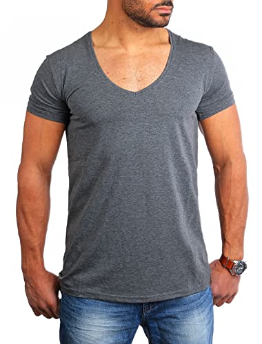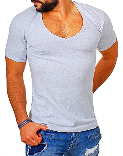 Young & Rich/Rerock - Maglietta da uomo in tinta unita con scollo a V extra profondo, Slimfit Deep Neck Stretch a V