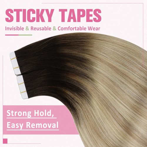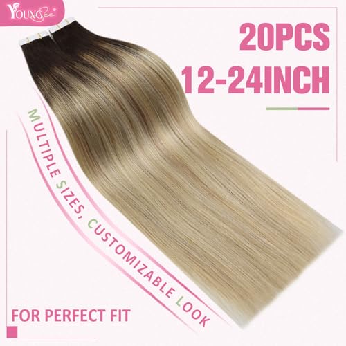 YoungSee Extensions Tape in Human Hair Balayage Ombre Dark Brown to Darkest Blonde with Platinum Blonde Tape in Human Hair Extensions 20 Pieces 50g Remy Human Hair Extensions Tape in Thick Hair 50cm