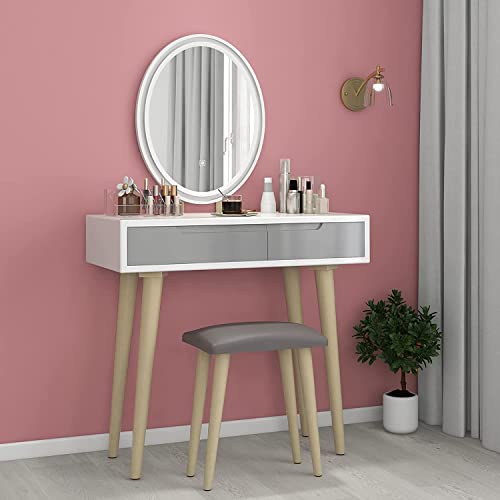 YOURLITE - Tavolino da toeletta con luci a LED, con Specchio Regolabile, Sgabello Imbottito e Organizer per Il Trucco (Bianco+Grigio+Specchio Ovale)