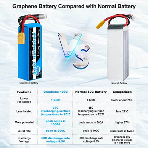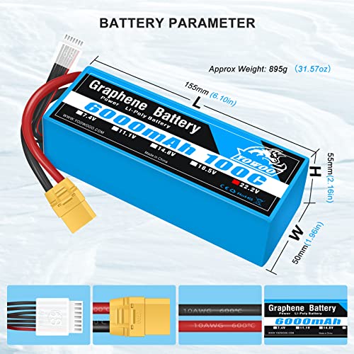 Yowoo 6S Batteria Lipo 6000mAh 100C 22,2V con spina XT90 per Mikado Logo 550, allineamento T-REX 550, 600, 700, Sab Goblin 630, grandi multirotori 1/5, scala Redcat Rally Arrma Mojave 6S (2 pezzi)