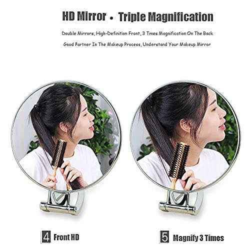 YSDS-JZ Specchio Trucco Ingranditore 3X / 1X Specchio A Mano Rotazione 360° Pieghevole, Impugnatura Comoda, Può Essere Appeso Dimensione Portatile, Specchio Da Viaggio Pieghevole,Argento,Round