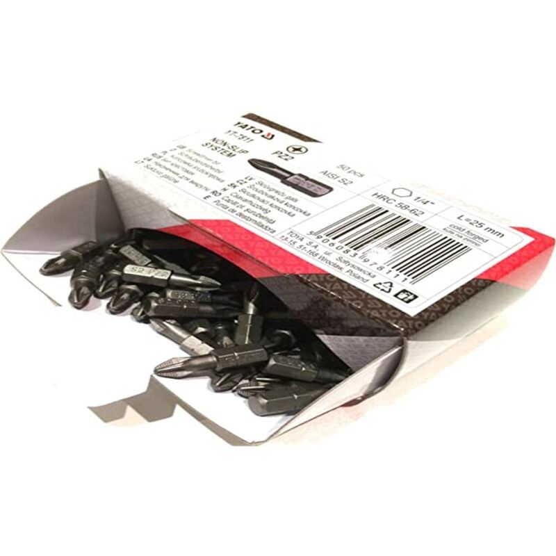 Yato Professional PZ2 - Punte per cacciavite antiscivolo, confezione da 50 pezzi, lunghezza 25 mm. Acciaio S2 di alta qualità utilizzato solo da un piccolo numero di produttori a causa del costo elevato. È più duro dell'acciaio 8650 comune ed è anche meno duttile. Le punte realizzate con questo acciaio hanno una durata migliore rispetto alla media. Specifiche tecniche: -Coppia massima 21.8Nm -AISI S2 -HRC58-62 Possiamo fornire fattura IVA su richiesta. Dai un'occhiata ai nostri altri articoli per strumenti di qualità premium.