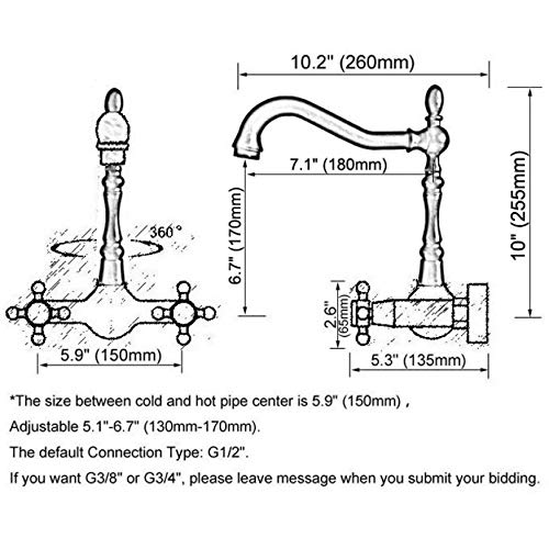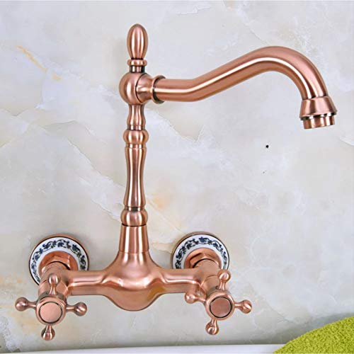 YTYASO Rubinetto Miscelatore per lavabo da Cucina in Ottone Rosso Rame Antico Rubinetto Girevole Base in Ceramica a Parete Doppie Maniglie a Croce