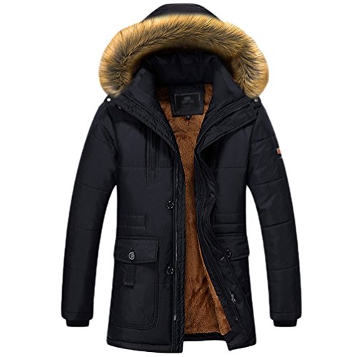 YuanDian Uomo Inverno Taglie Forti Cotone Imbottito Cappotti Parka Pelliccia Sintetica Colletto con Cappuccio Addensare Velluto Fodera Caldo Antivento Impermeabile Giacchetto Nero 2XL